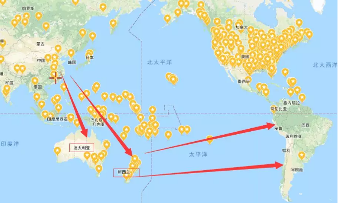 方案三:經過澳大利亞新西蘭中轉到南美