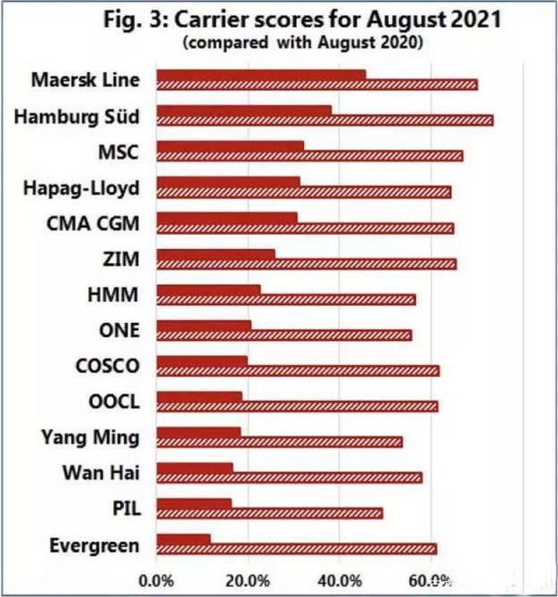 上海航運交易所發布的全球班輪公司準班率報告顯示,7月,全球14大班輪公司的準班率總體漲少跌多。2021年第28周,漢堡南美到港服務準班率排名首位,為66.77%,同時收發貨服務準班率升至第二,為33.33%,地中海航運到離港服務準班率跌至第二,為21.95%;長榮海運排名末位,僅為6.15%。