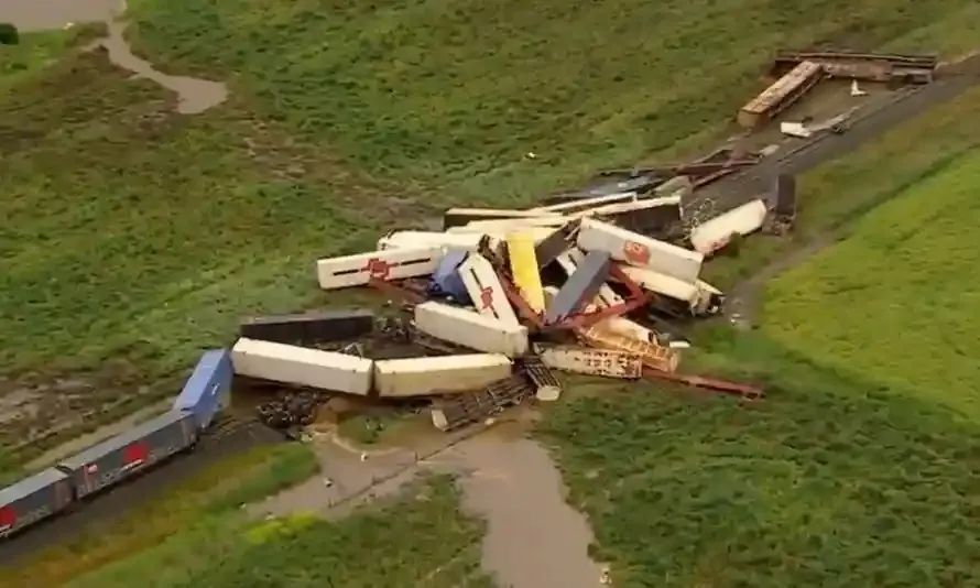 據(jù)悉,脫軌事故發(fā)生在一個(gè)平交道口附近。該列車有16節(jié)車廂,發(fā)生脫軌后,集裝箱被掉落在軌道兩側(cè),部分集裝箱還掉在了相鄰的圍場內(nèi)。