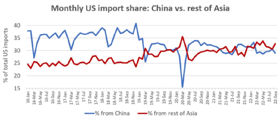 2016-2018年,中國(guó)平均占美國(guó)進(jìn)口貨物噸位的36%,其他亞洲國(guó)家僅占25%。2019年,中國(guó)的月平均份額下降到31%,而亞洲其他國(guó)家的份額上升到29%。在2020-2021年,兩者的比例開(kāi)始齊平,各占30%。