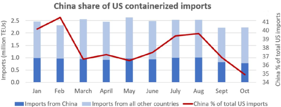 據(jù)加拿大咨詢(xún)公司Descartes的最新數(shù)據(jù)顯示,美國(guó)10月份的集裝箱進(jìn)口與9月份持平(增長(zhǎng)0.2%)。但從中國(guó)的進(jìn)口量環(huán)比下降5.5%,減少了45,071個(gè)標(biāo)準(zhǔn)箱。中國(guó)出口的下降被來(lái)自泰國(guó)、韓國(guó)、臺(tái)灣地區(qū)、日本和其他國(guó)家的增長(zhǎng)完全抵消。