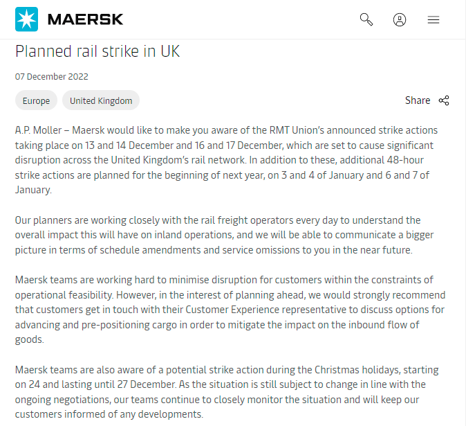 馬士基表示,罷工將導致整個英國鐵路網的嚴重中斷,并每天與鐵路貨運運營商密切合作。