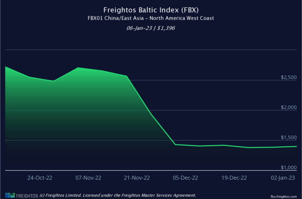 Peter1月6日,從遠東到美國西海岸的40英尺集裝箱出口航線(FEU)即時運價已降至1,647美元。而且一年前,同一航線的運價接近10,000美元。