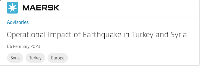 2月6日,馬士基發布了關于土耳其和敘利亞地震的通知。該公司表示,卡赫拉曼馬拉斯省的強震導致了地震。(Kahramanmaras)帕扎西克(Pazarcik)包括伊斯肯德倫港在內的物流和運輸基礎設施受到嚴重損害。