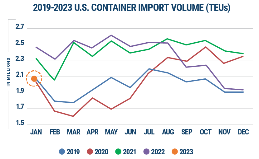 更詳細地說,2023年1月,美國集裝箱進口量為206.8萬英尺的標準箱(TEU),雖然環比增長,但與2022年1月相比,同比下降16.1%,但僅比疫情前2019年1月下降0.3%。