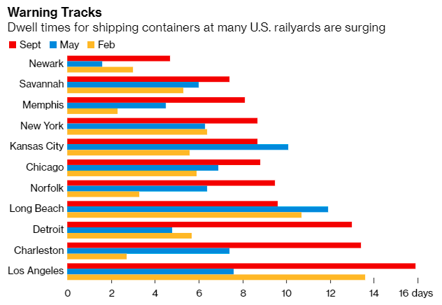 要了解為什么從南加州到喬治亞州薩凡納的美國港口有100多艘集裝箱船正在排隊等待泊位,這需要密切關注另一個重要的貨運樞紐:鐵路場站的擁堵情況。