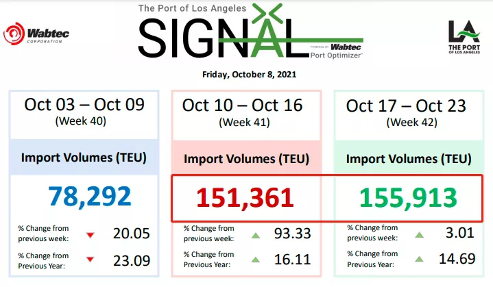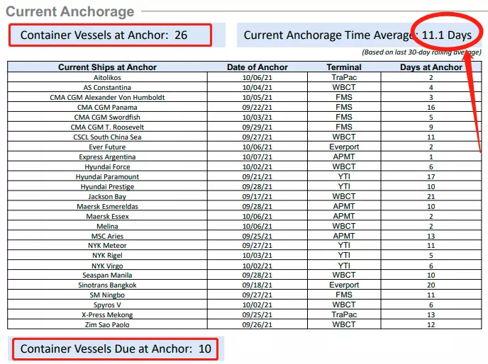 擁堵持續(xù)惡化,據(jù)洛杉磯港signal平臺(tái)10月8日的最新數(shù)據(jù),目前光在洛杉磯錨地等待泊位的集裝箱船就達(dá)到26艘,在港外等待的船舶達(dá)到10,艘,平均等待靠泊時(shí)間上一期的10.7天激增至11.1天。而第41/42周的貨量繼續(xù)增長(zhǎng)。