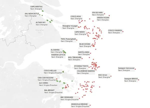 據 eeSea 公司稱,有超過 60 艘裝滿進口貨物的集裝箱船滯留在洛杉磯和長灘的近海。但截至周五為 154 艘,有兩倍多,都是等待從中國上海和寧波裝載出口貨物。