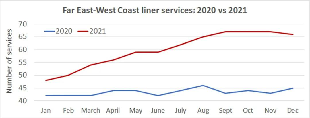 據 eeSea 稱,美東-西海岸航線的數量從 1 月份的 48 條激增至本月的 67 條。相比之下,這條車道上的服務數量去年保持相當穩定,為 42-46。