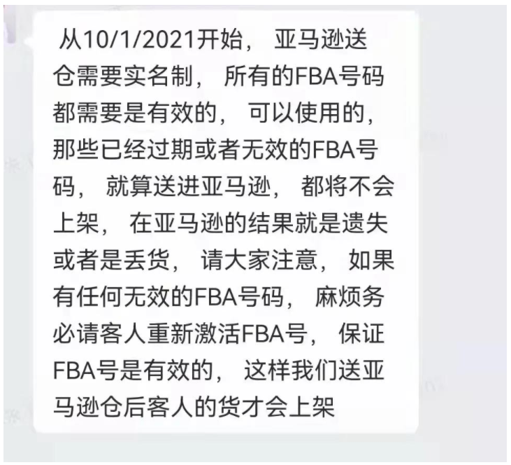 換句話說,從2021年10月1日開始,亞馬遜送倉必須實名制加對應有效FBA編號,送倉的貨件FBA編號必須正確對應,否則將無法上架!