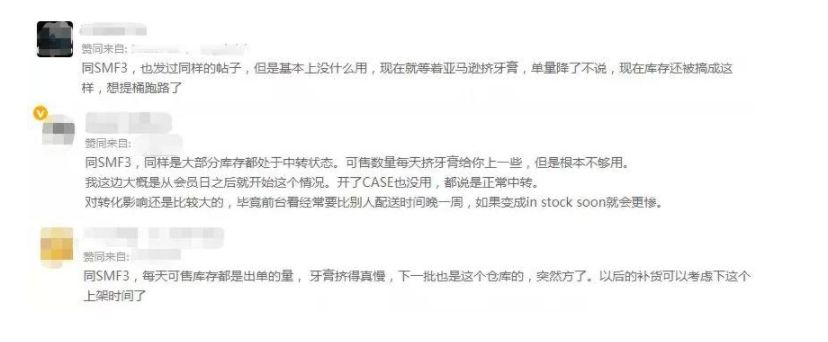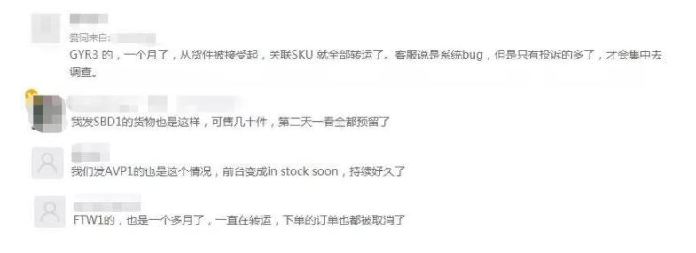 有賣家在論壇上發文稱,剛發往倉庫的3000個庫存預留轉運,幾十個sku的2000多個可售庫存也變成預留,可售庫存一下子變為0,店鋪商品頁全部顯示in stock soon,訂單數量降到原先的10%,而這些情況就發生在短短3天時間里。